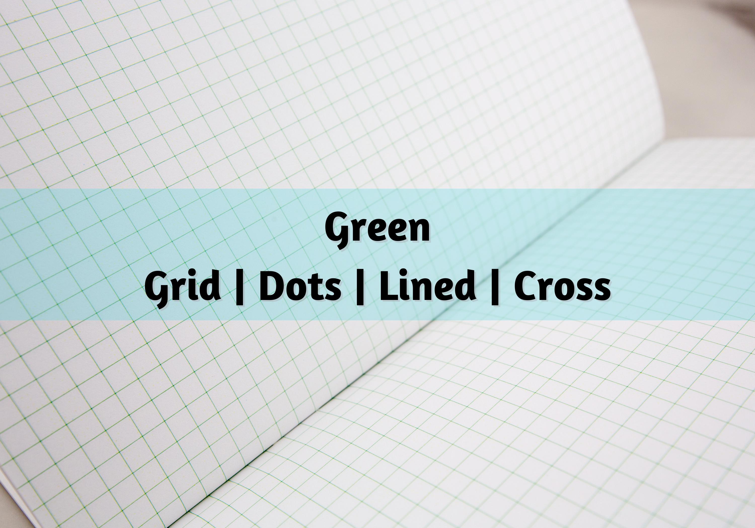 - Styles: Grid (5 x 5 mm Green), Dots (5 x 5 mm Green), Lined (6.5 mm Green), Cross (5 x 5 mm Green), Blank