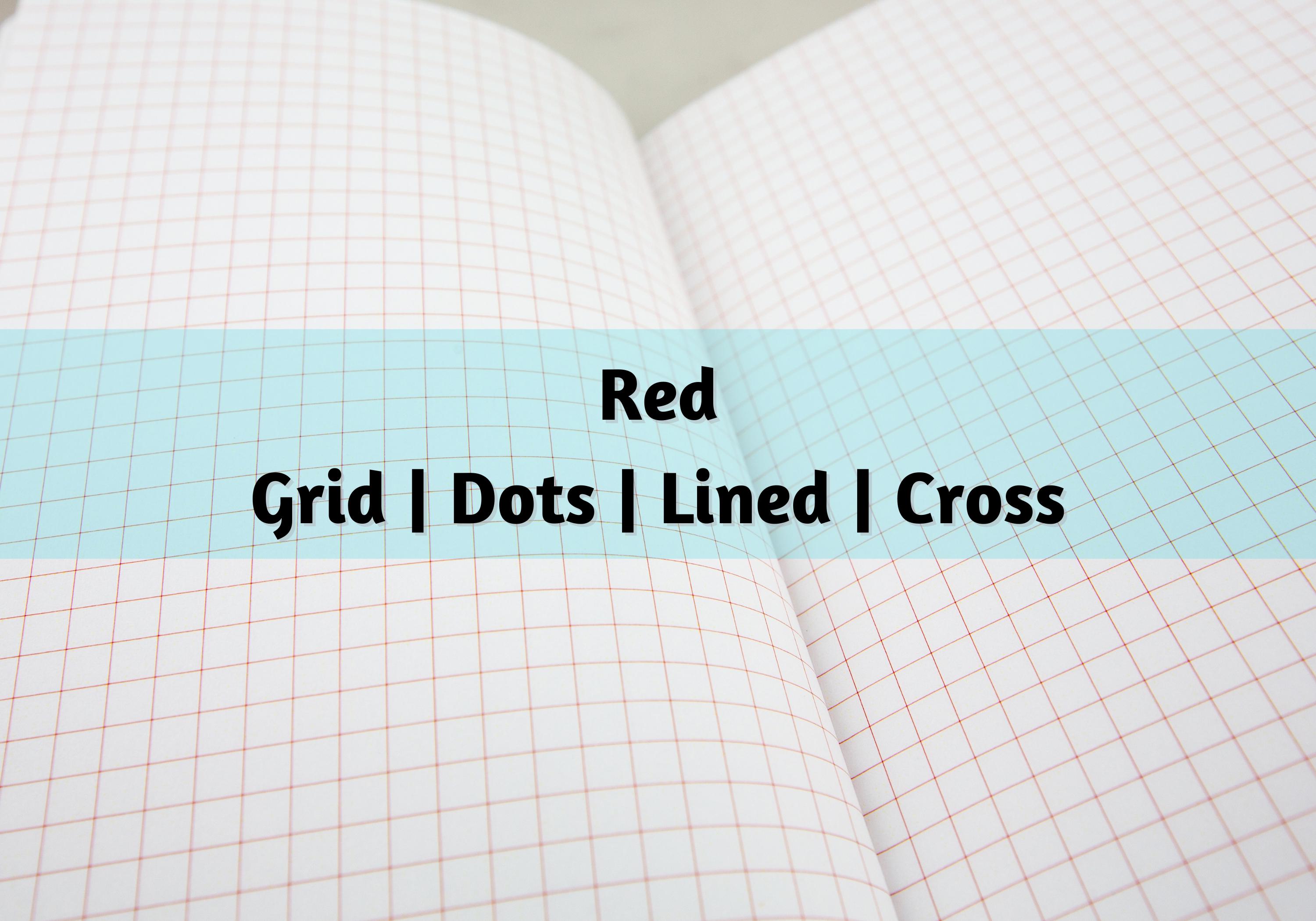 - Styles: Grid (5 x 5 mm Red), Dots (5 x 5 mm Red), Lined (6.5 mm Red), Cross (5 x 5 mm Red), Blank